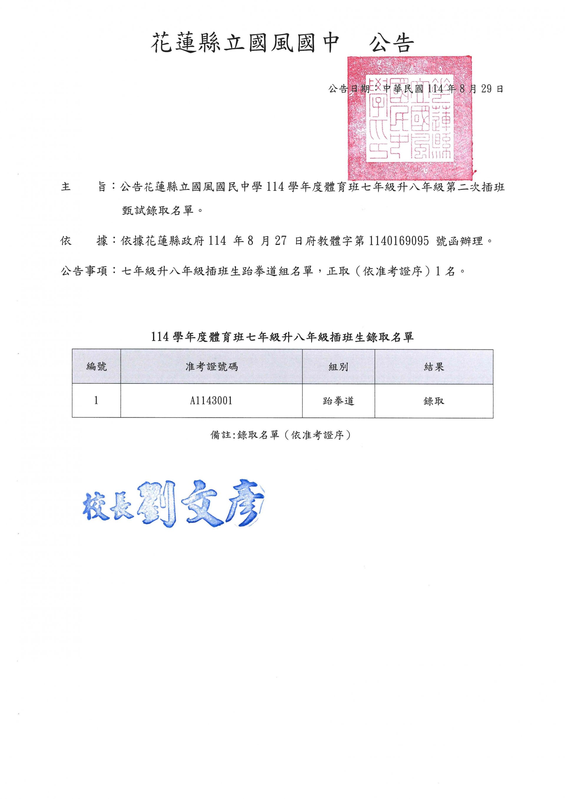 114 學年度體育班 七年級升八年級第二次插班甄試錄取名單