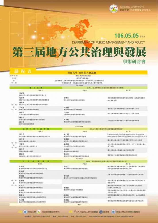 主旨: | 轉知「2017 年第 3 屆地方公共治理與發展學術研討會」,歡迎貴屬人員自由報名參加,並於 106 年 5 月 2 日(星期二)前完成線上報名,請查照。 |