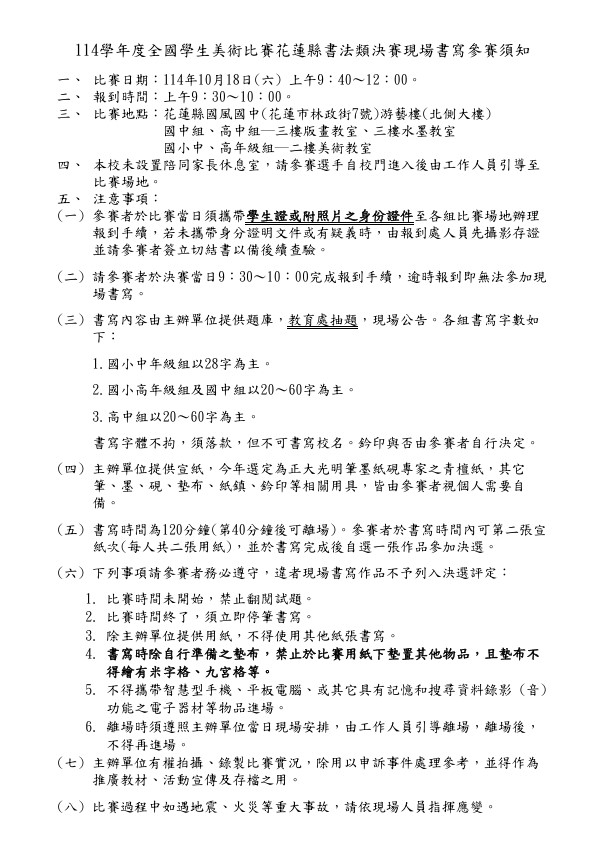 (九) 前述各項參賽須知如有修正,以正式寄發之書面參賽通知為準,並發布於花蓮縣政府教育處處務公告。
