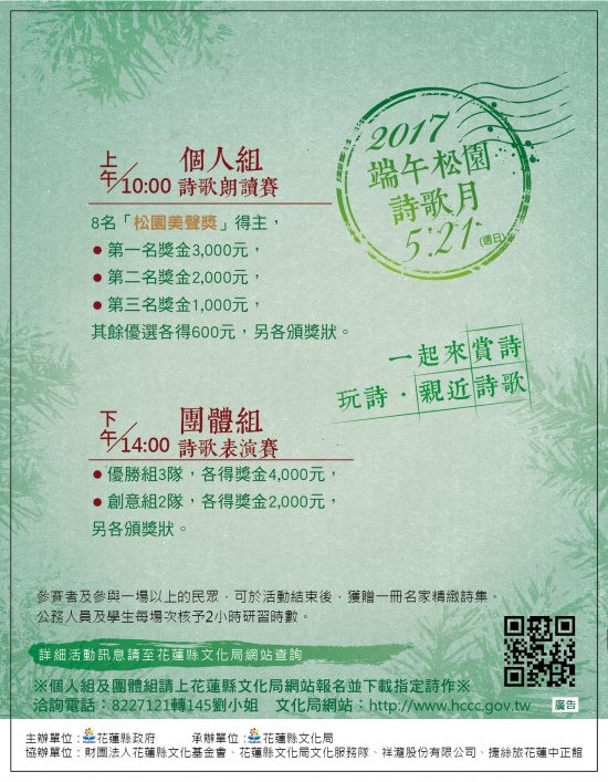為慶祝端午節(詩人節),本局訂於 106 年 5 月 21 日(週日)假松園別館(地址:花蓮市松園街 65 號)小木屋辦理「106 年端午松園詩歌月」活動,敬請貴單位轉知並鼓勵教職員生踴躍參加,至紉公誼。 |