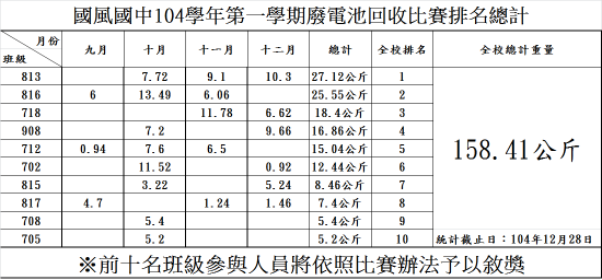 104 學年第一學期廢乾電池比賽成績公佈,累計前十名公佈於川堂公佈欄。統計數量如有誤植,請至學務處衛生組修正。