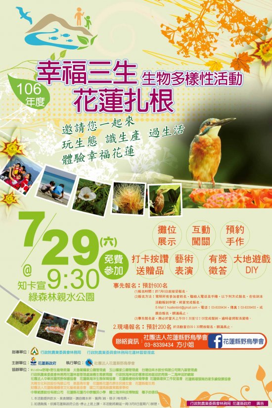 主旨: | 本府訂於 106 年 7 月 29 日(六)在知卡宣綠森林親水公園舉辦「106 年度幸福三生花蓮扎根生物多樣性活動」,敬請轉知所屬踴躍參加,請查照。 |