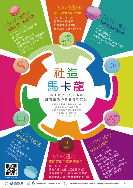 一、 | 社區營造就像知名甜點馬卡龍,各類社造工作繽紛多彩,辛苦的揉合製作終有甜美成果。今年度以「社造馬卡龍」為主題,於 10 月 19-29 日辦理系列活動,包含文史調查、社區繪本、影像紀錄、多元文化、社區散步、社區傳藝等年度社區營造成果發表,歡迎踴躍參加。 |