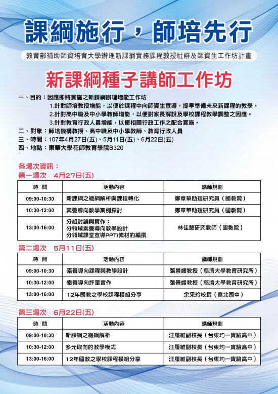 國立東華大學師資培育中心辦理「課綱施行,師培先行-種子講師工作坊」活動訊息。