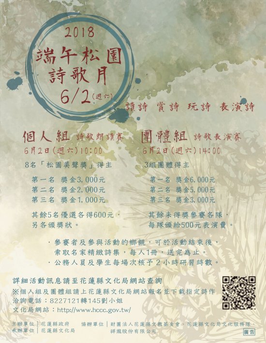 三、 | 活動詳情及報名請逕上網站查詢:http://www.hccc.gov.tw/zh-tw/News/Detail/7847,或電洽 8227121 轉 145 藝文推廣科劉小姐。 |