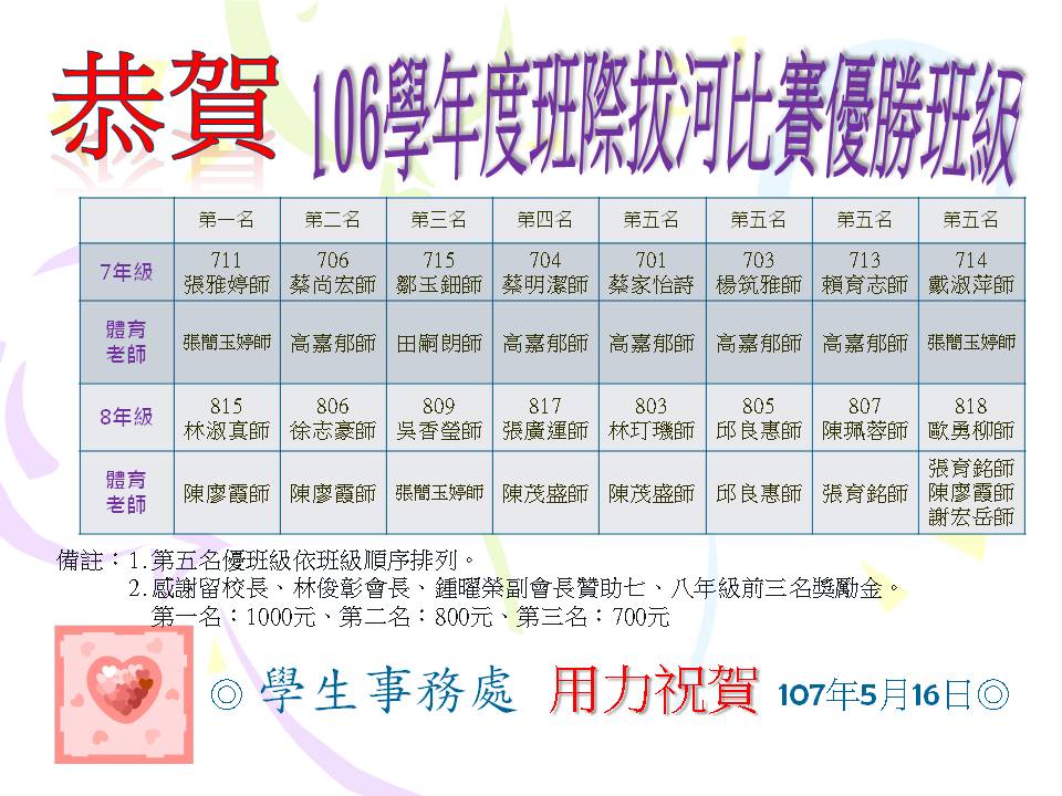 狂賀!恭喜106學年度國風國中7、8年級班際拔河比賽優勝班級!