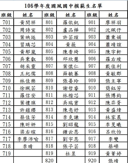 狂賀!公告106學年度國風國中各班模範生得獎名單!