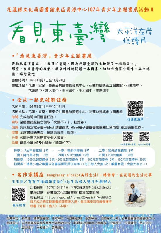 二、上揭「看見東臺灣」活動內容如下:(一)主題書展:活動日期自107年10月1日至11月23日分別於花蓮縣文化局圖書館1樓東區資源中心、13鄉鎮市立圖書館、6所聯展學校及公共圖書館宜蘭、臺東分區資源中心等據點展出。(二)全民破解活動:活動日期自107年10月1日至10月31日,活動地點為花蓮縣文化局圖書館及13鄉鎮市立圖書館,活動詳情請參閱海報。(三)與作家有約講座:訂於10月14日(日)下午2時至4時,活動地點:花蓮縣文化局圖書館1樓文化電影院,採網路報名方式,名額有限,計60位,額滿為止。