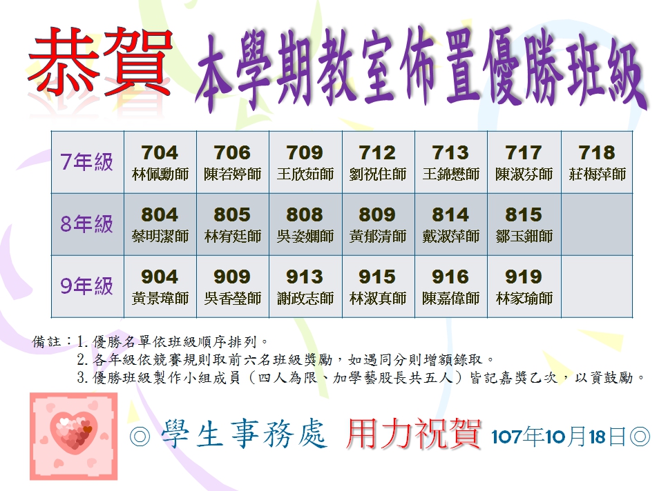 狂賀!恭喜國風國中107學年度第1學期教室布置優勝名單!