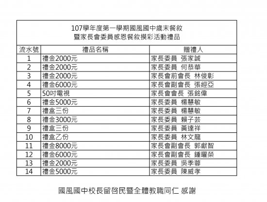 【感恩】107學年度第1學期國風國中期末餐敘暨家長委員感恩餐敘摸彩活動家長委員提供禮品清單。