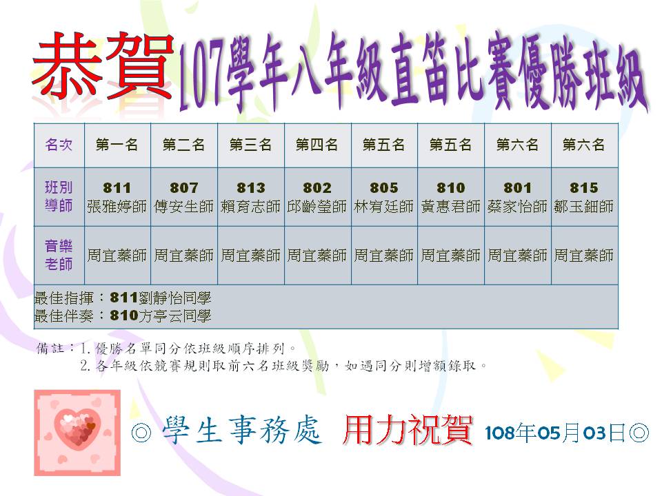狂賀!恭喜本校107學年度八年級班際直笛音樂比賽優勝名單!