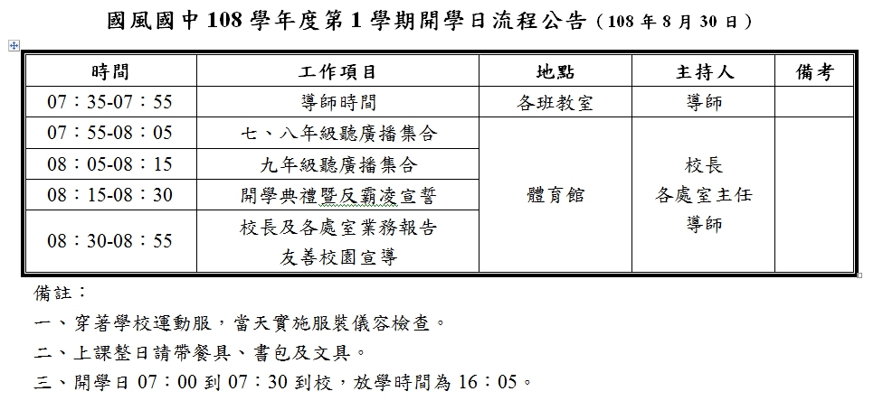 國風國中108學年度第1學期開學日流程公告(108年8月30日)!