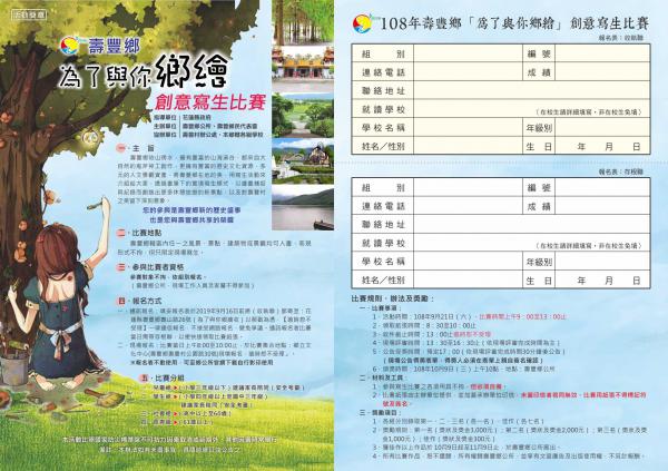 壽豐鄉-為了與您鄉繪-創意寫生比賽 報名時間:108 年 9 月 16 日止 比賽時間:108 年 9 月 21 日上午 9:00 至 13:00 止 ((詳細活動內容請看簡章說明) 公所聯絡窗口民政課 03-8652131 轉分機 122 。