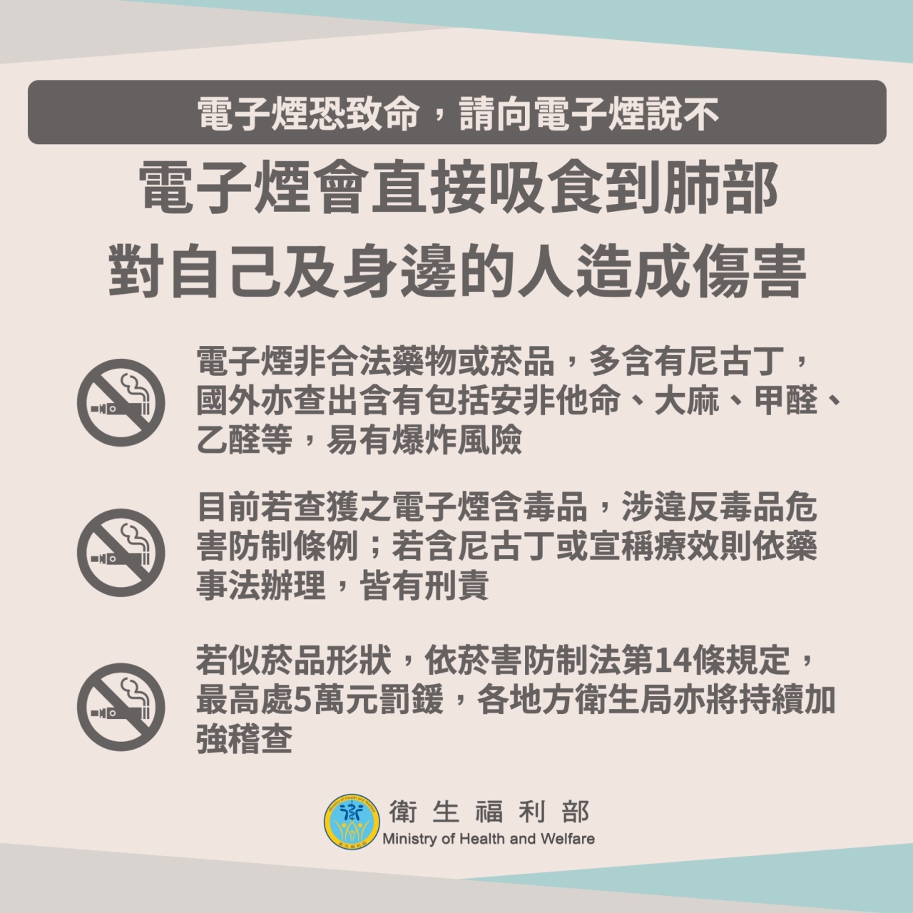 三、其他有關電子煙危害、吸食率、國內外管理現況及防範策略等衛教資源,可逕至衛生福利部國民健康署「電子煙防制專區」網站下載最新資訊及運用,網址: https://www.hpa.gov.tw/Pages/List.aspx?nodeid=444 。 |