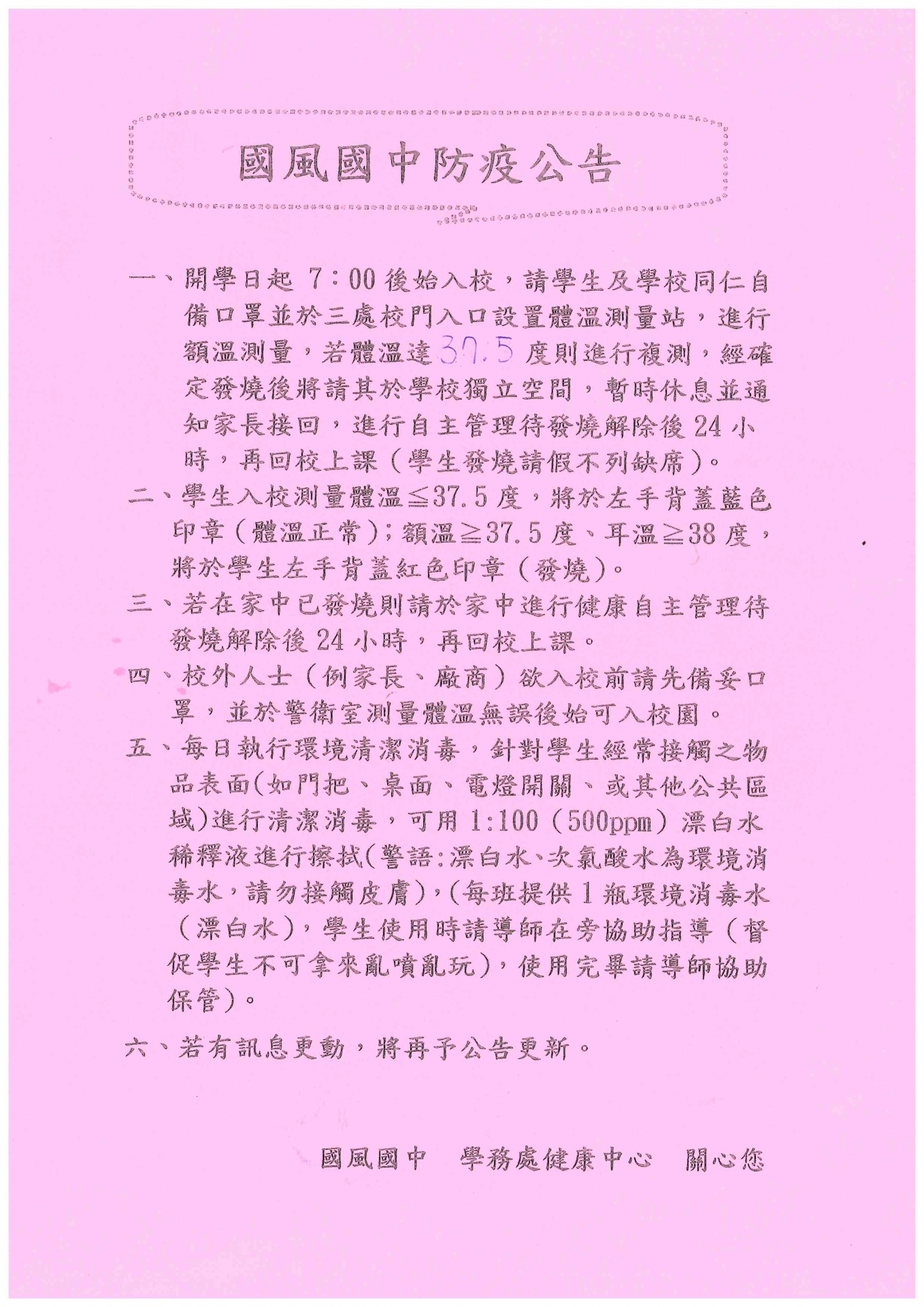 國風國中防疫公告(有關本校學生開學入校測量體溫事宜)