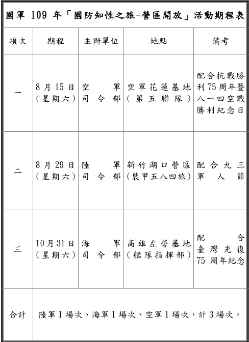 公告國防部民國109年「國防知性之旅-營區開放」活動期程表!