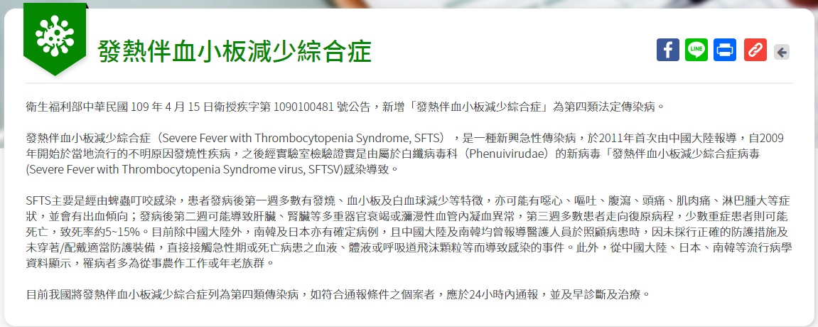 一、修正係新增「發熱伴血小板減少綜合症」為第四類傳染病。