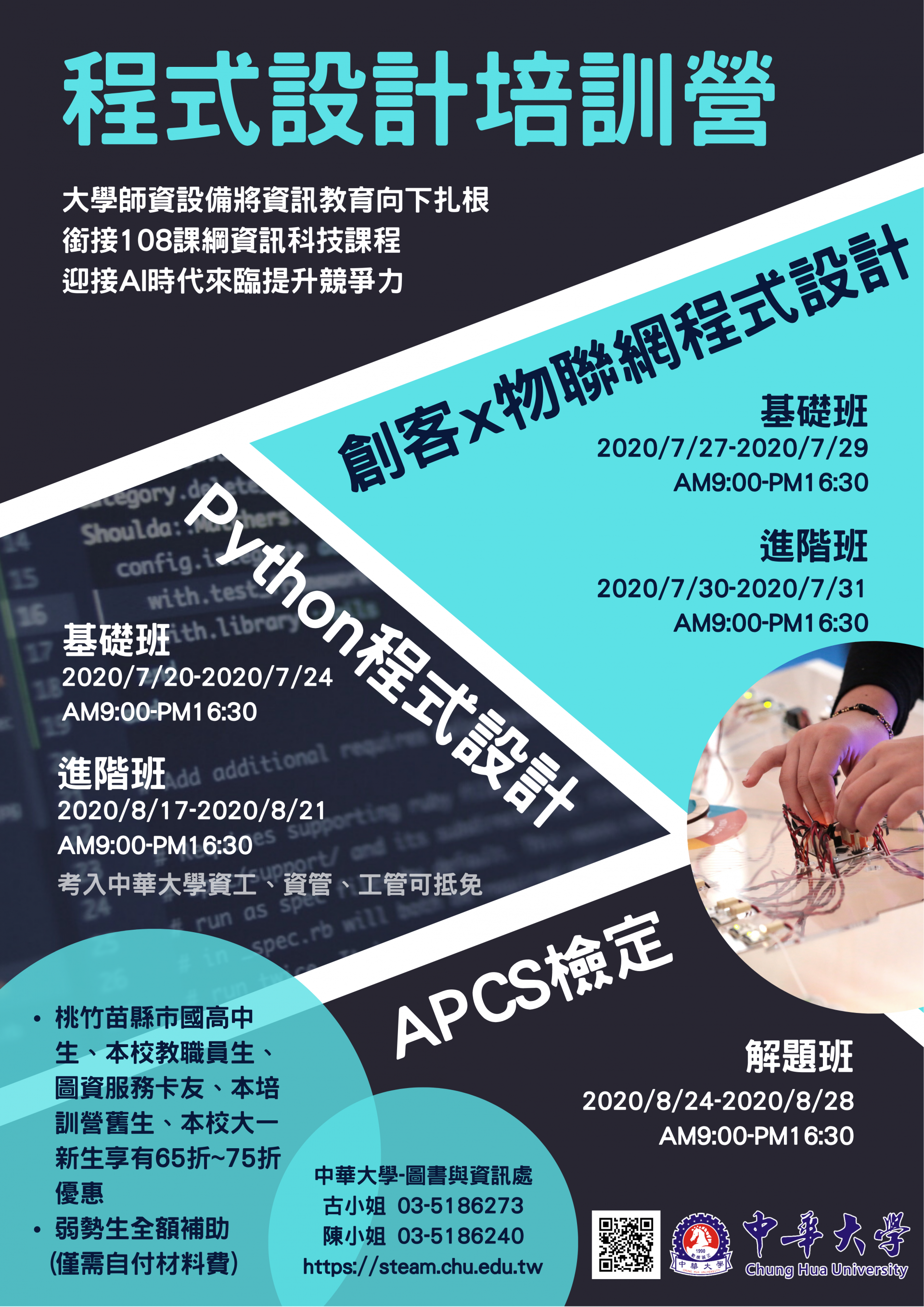 一、 | 旨揭中華大學「程式設計培訓營」共五門課程,旨在讓國小高年級生、國中生與高中生可以順利銜接 108 課綱資訊科技領域必修的程式設計課程,培養學生運用程式設計解決問題的能力,有助於提升學生於數位時代之競爭力。 |