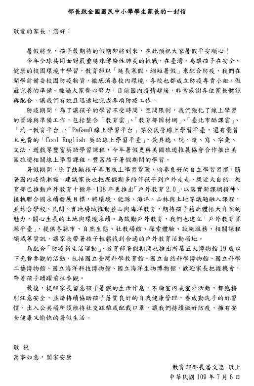 公告!部長致全國國民中小學學生家長的一封信