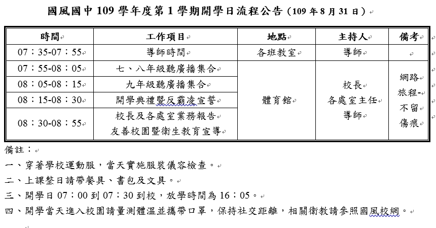 國風國中109學年度第1學期開學日流程公告(109年8月31日)