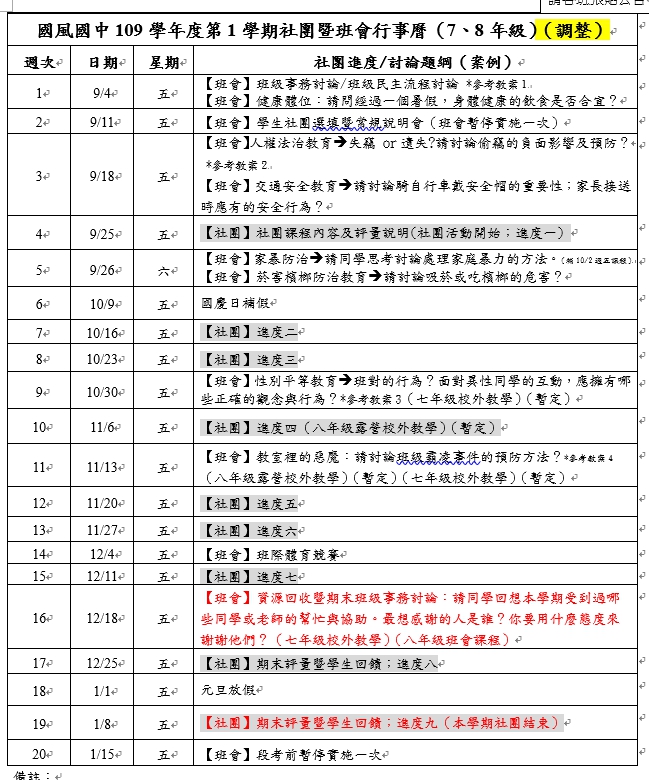 公告國風國中109學年度第1學期社團暨班會行事曆(7、8年級)(調整)