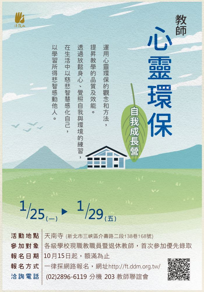 財團法人法鼓山佛教基金會訂於110年1月25日(星期一)至1月29日(星期五)辦理「2021寒假教師心靈環保自我成長營」活動。