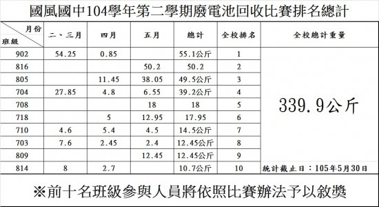 104 學年第二學期廢乾電池回收比賽已於 5 月 30 日中午截止,前十名如附件,如有誤植請於 6 月 1 日放學前,前往學務處修正,前十名班級依比賽辦法敘獎。
