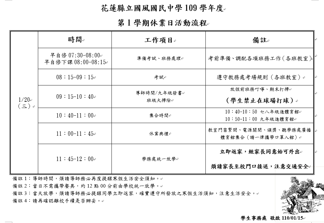 花蓮縣立國風國民中學109學年度 第1學期休業日活動流程!