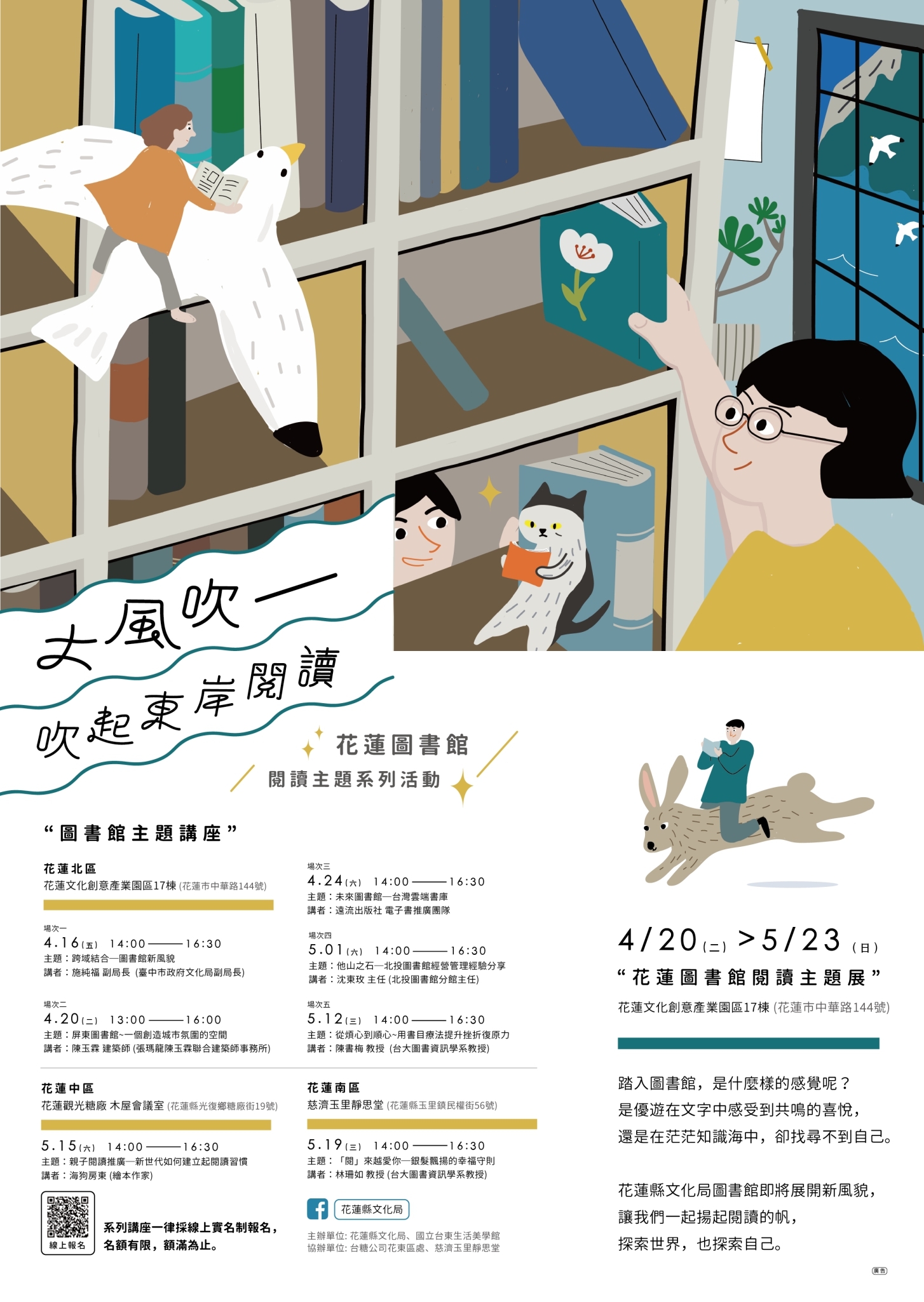 本局辦理「大風吹─吹起東岸閱讀,花蓮圖書館閱讀主題展」系列活動,敬邀貴單位派員參與,並請協助宣傳周知,毋任感荷。