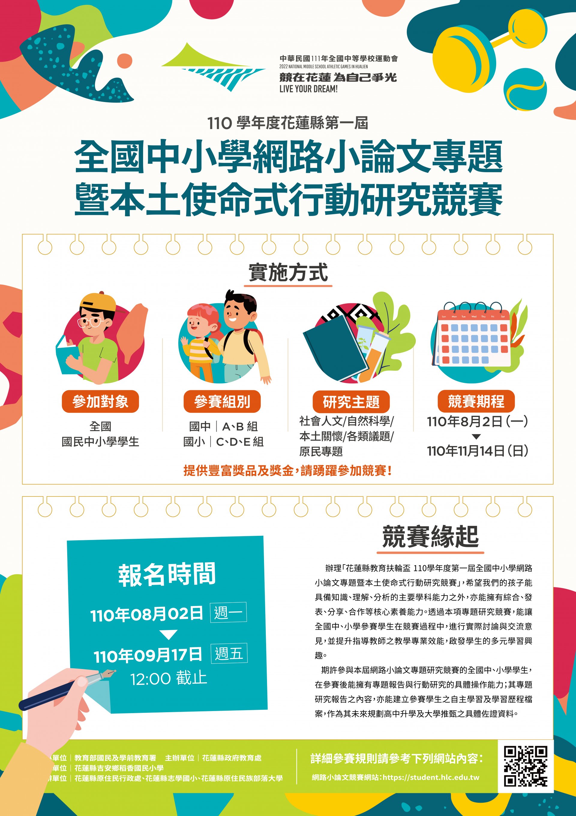 主旨: | 檢送「110 學年度花蓮縣第一屆全國中小學網路小論文暨本土使命式行動研究競賽」海報 1 份,請貴校公告並鼓勵師生踴躍報名參賽,請查照。 |