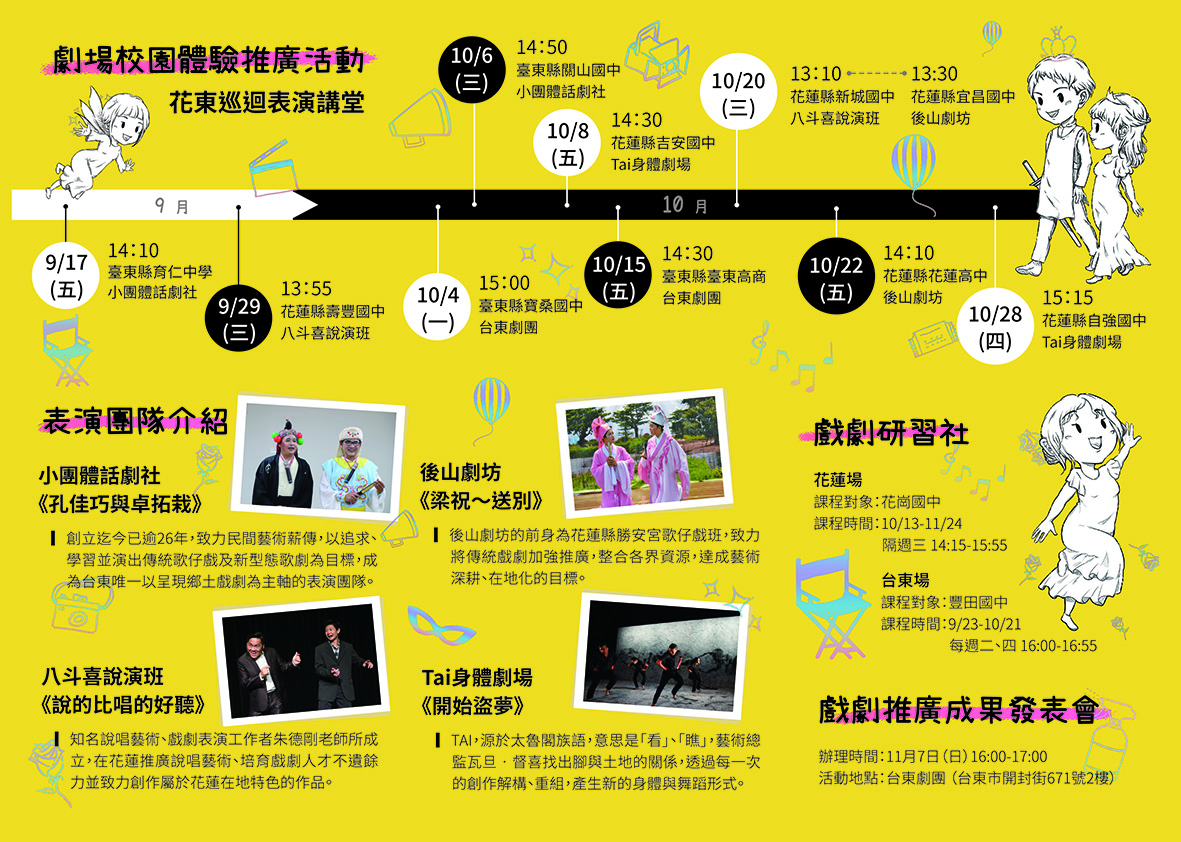 二、 | 戲劇工作坊-花蓮場上課地點在花蓮文化創意產業園區第 16 棟,分成兩階段進行,在 10/30 日(六)、 10 月 31 日(日) 09:00-16:00 辦理,第一階段課程為劇場肢體與空間探索,第二階段課程內容為劇場想像與創作。兩天活動皆提供午餐。 |