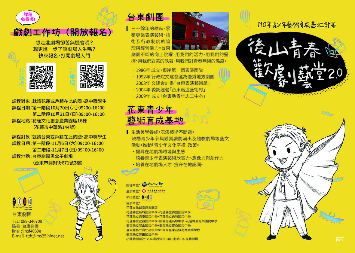 一、 | 依據「110 青少年藝術育成基地計畫-後山青春歡劇藝堂 2.0」計畫辦理。 |