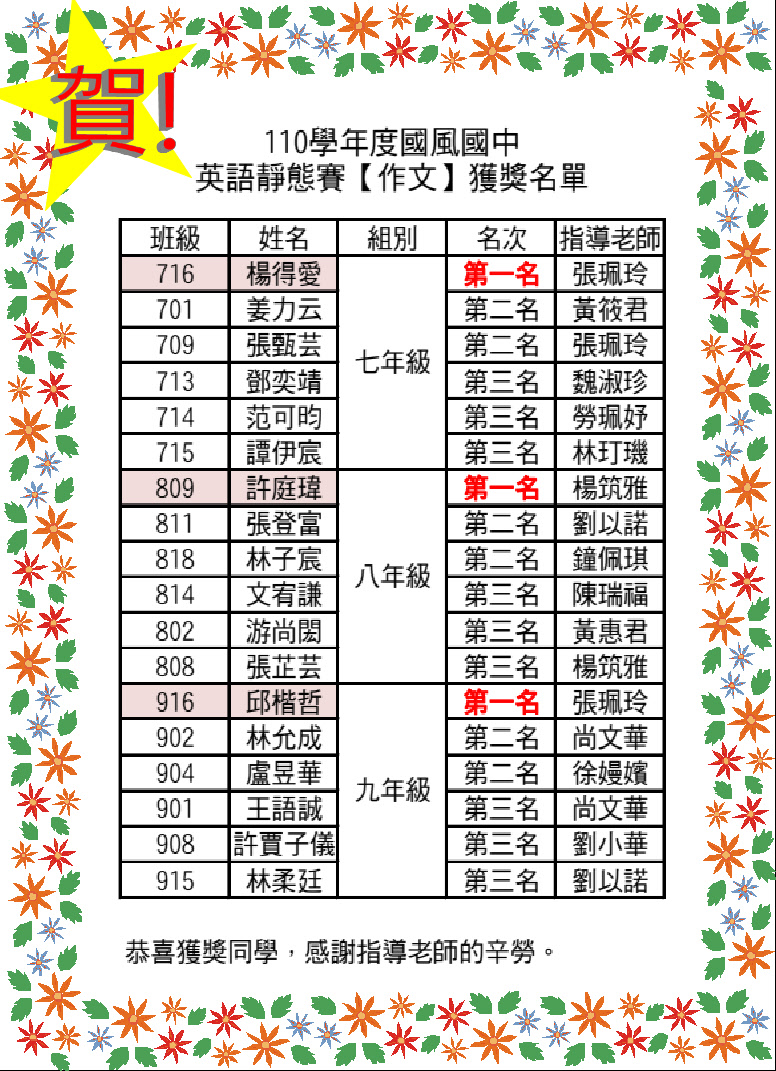 110學年度校內英文作文比賽得獎名單
