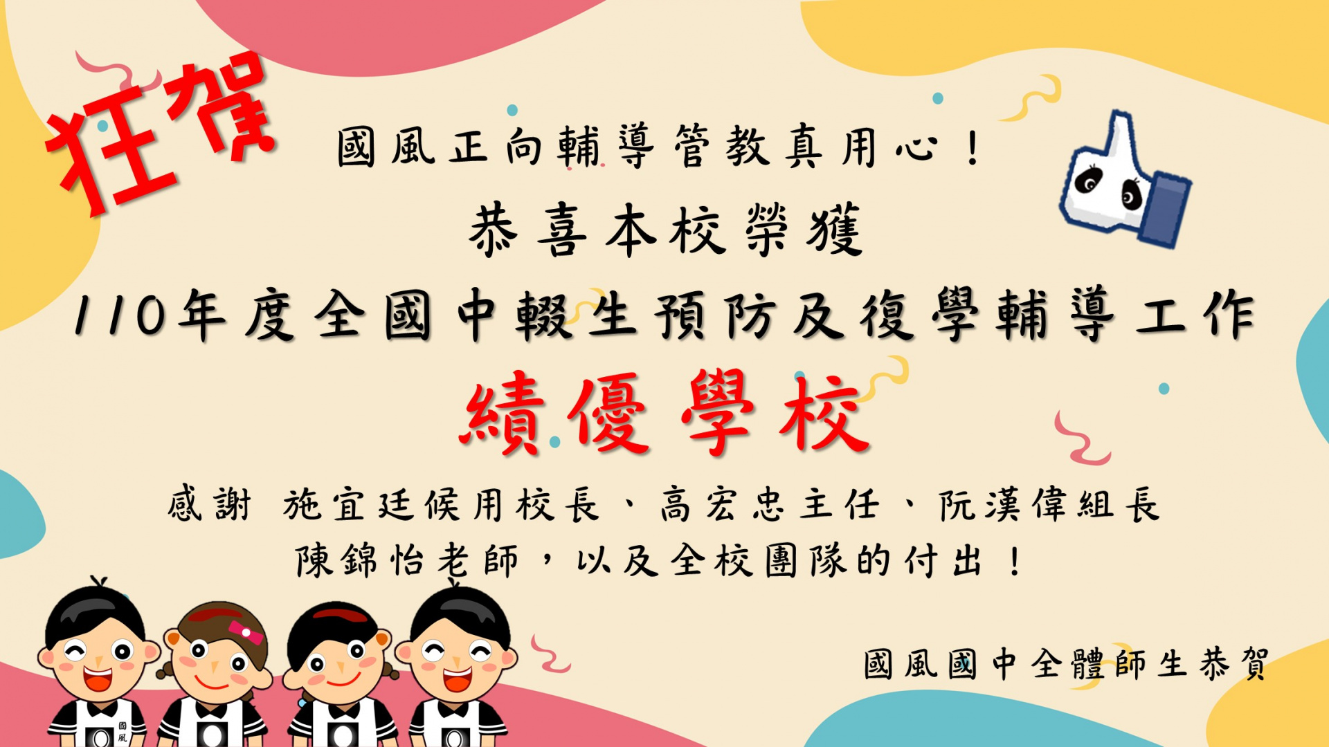 狂賀!國風正向輔導管教真用心!恭喜本校榮獲110年度全國中輟生預防及復學輔導工作「績優學校」!