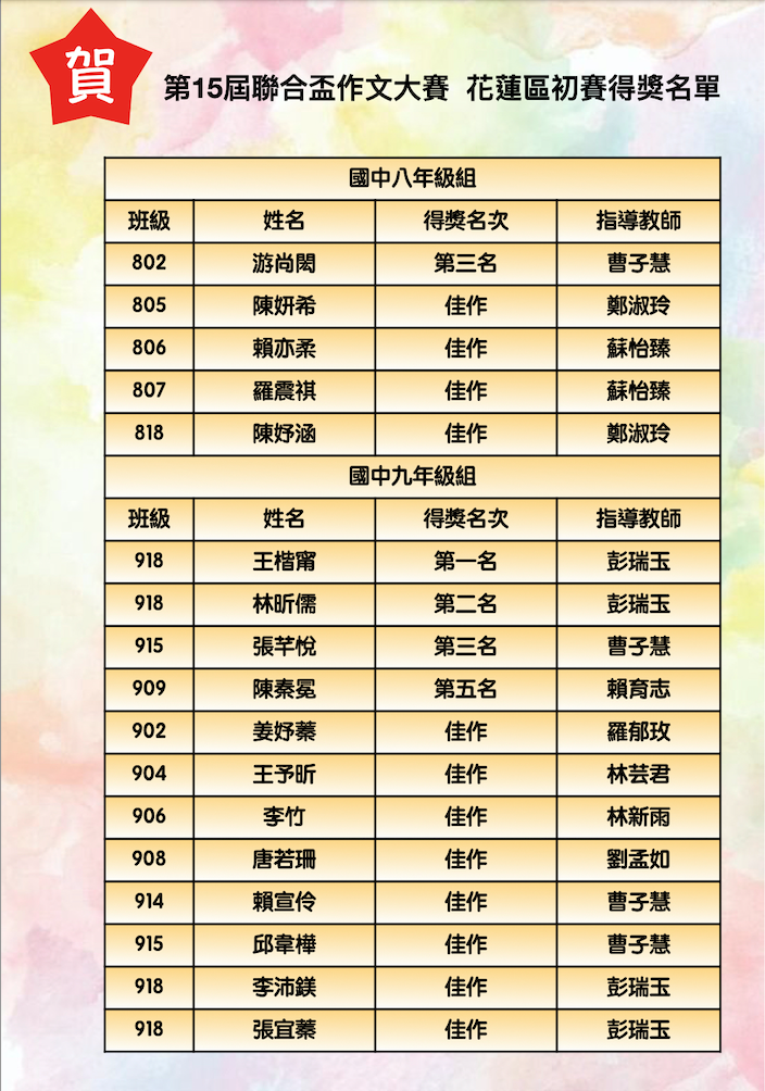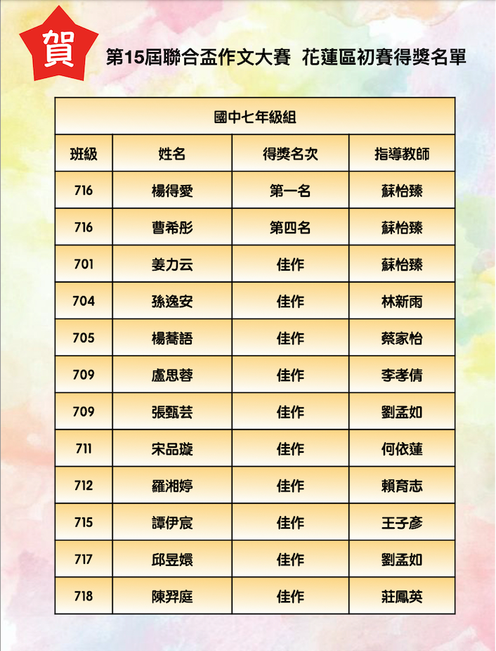 第15屆聯合盃作文大賽花蓮區初賽得獎名單