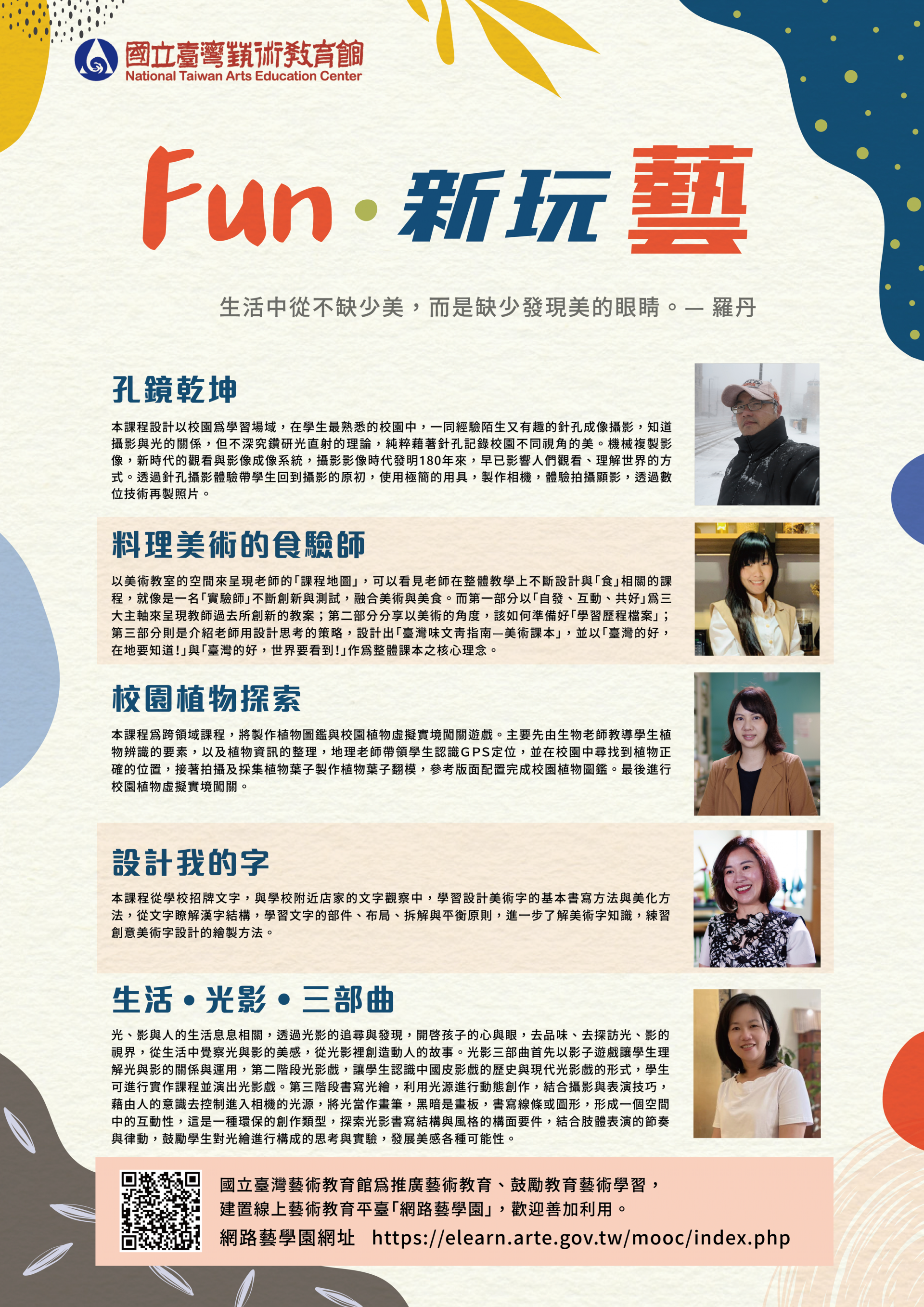五、 | 另,國立臺灣藝術教育館不定期舉辦「網路藝學園」課程推廣活動,歡迎關注臉書粉專訊息(https://www.facebook.com/ntaec/)。 |