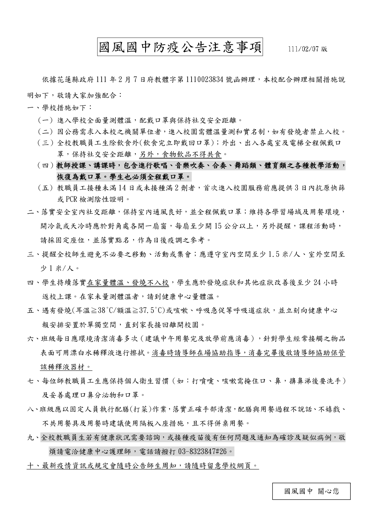 本校111年2月10日防疫公告