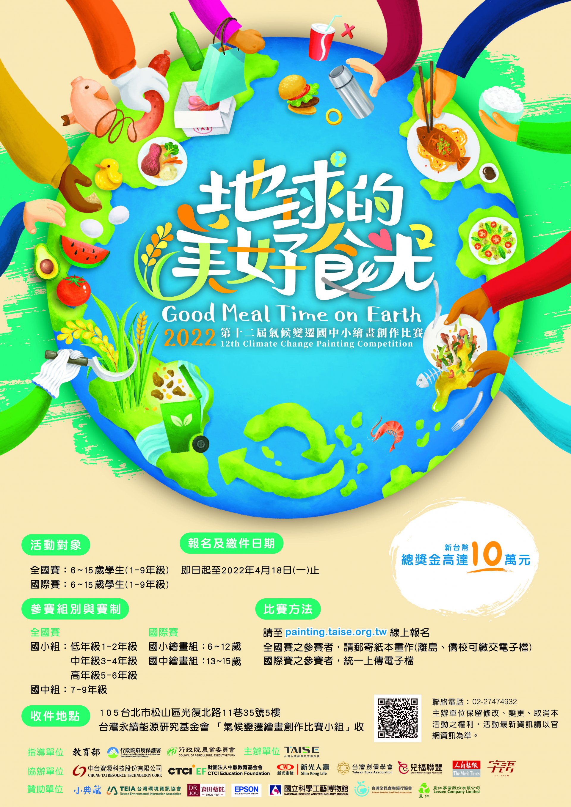 一、 | 由教育部、行政院環境保護署、行政院農業委員會指導,本會主辦之「氣候變遷國中小繪畫創作比賽」迄今已舉辦 11 屆,一共累計 37 國、 52,666 名學子參與。本屆為第 12 屆,為呼應聯合國永續發展目標(SDGs)的第 2 、 12 項,以「地球的美好『食』光」為主題,強化國中小學生、教師對糧食安全、永續農業、營養均衡與永續消費與生產等相關議題的認知,以及拓展國際觀並付諸實際的氣候行動。比賽也呼應聯合國永續發展目標第 13 項,鼓勵積極採取氣候行動,並提升大眾相關意識。 |