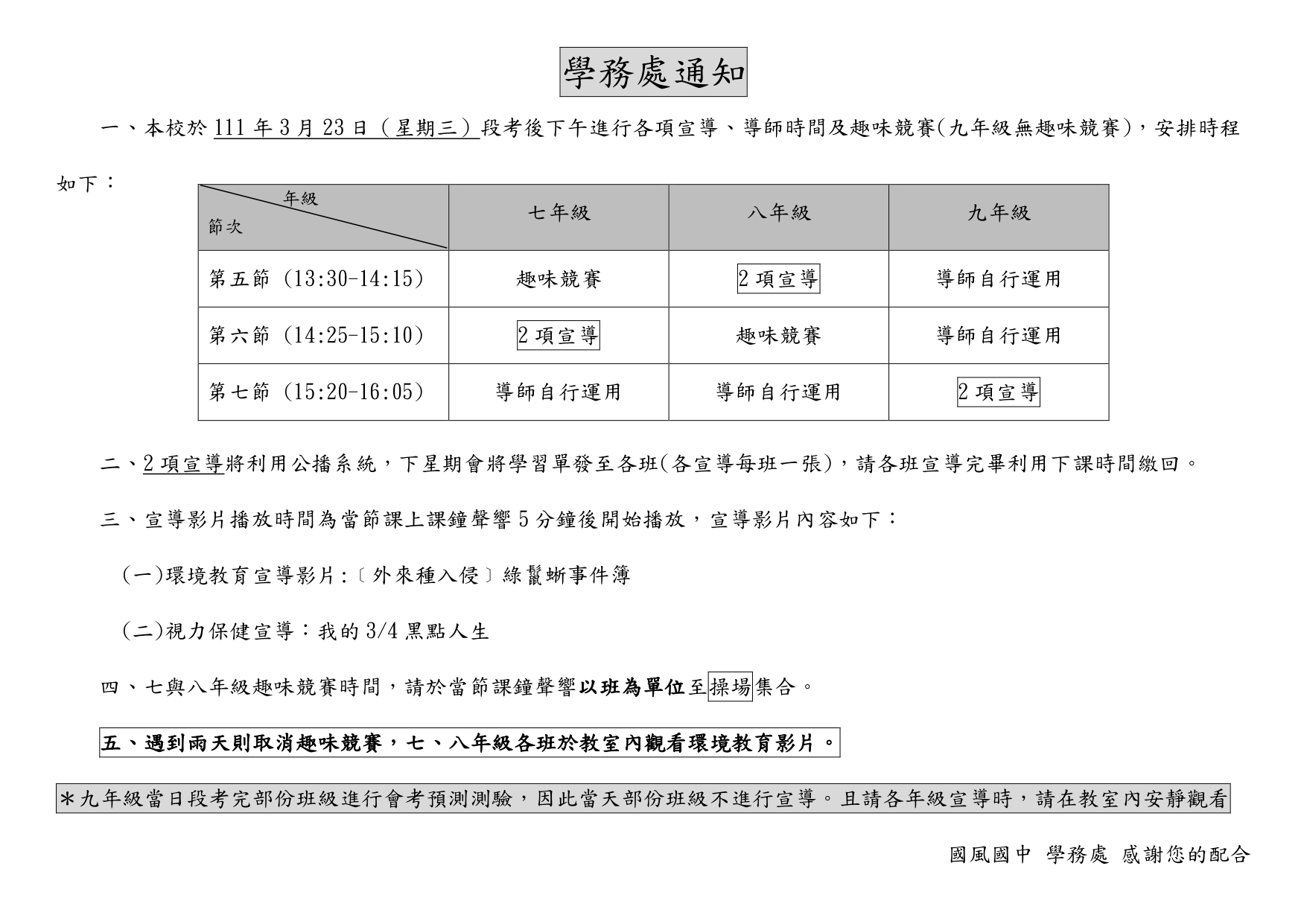 111年3月23日下午時程安排如下(請非導師同仁務必注意)