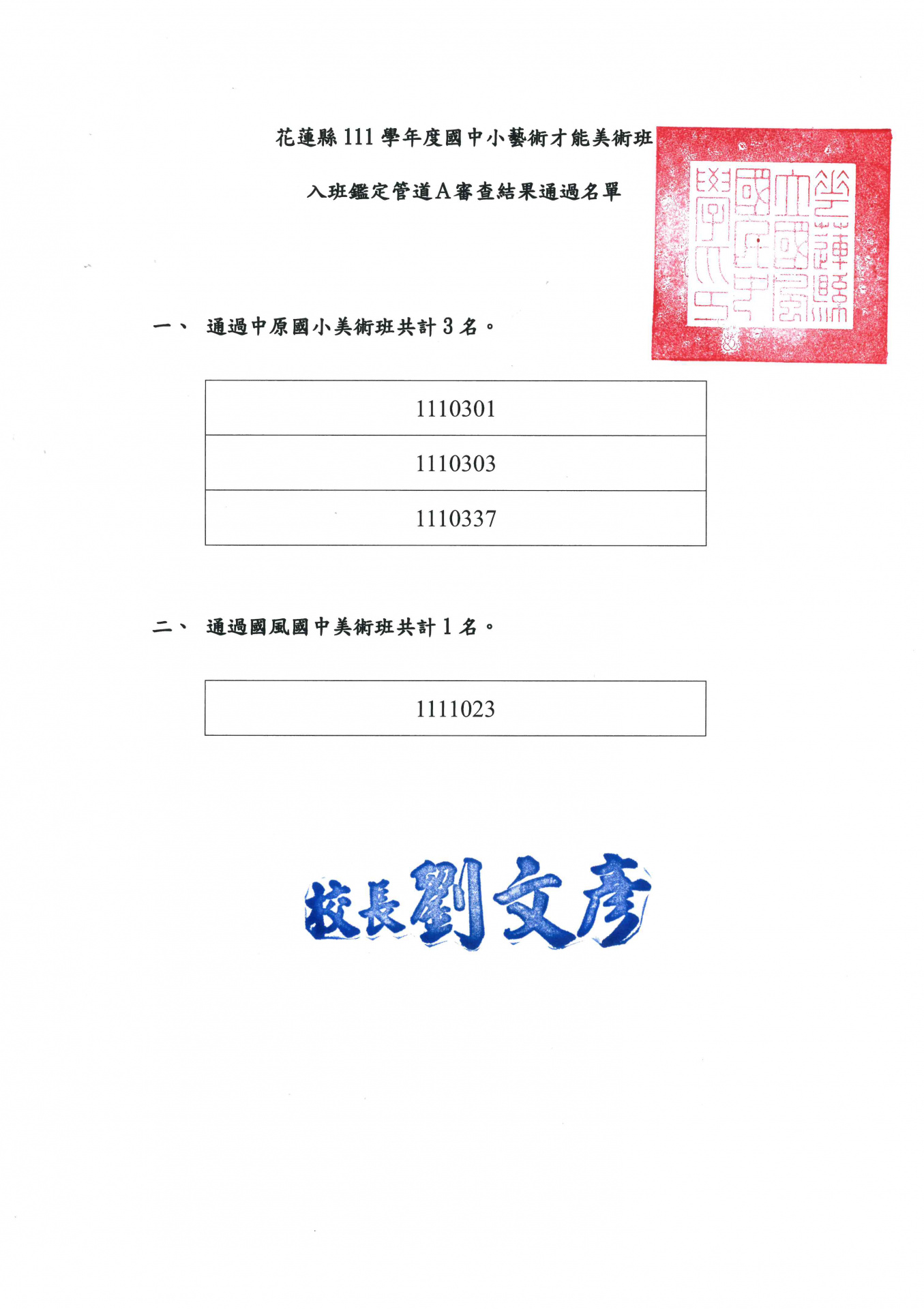 花蓮縣111學年度國風國中藝術才能班入班鑑定管道A審查結果通過名單