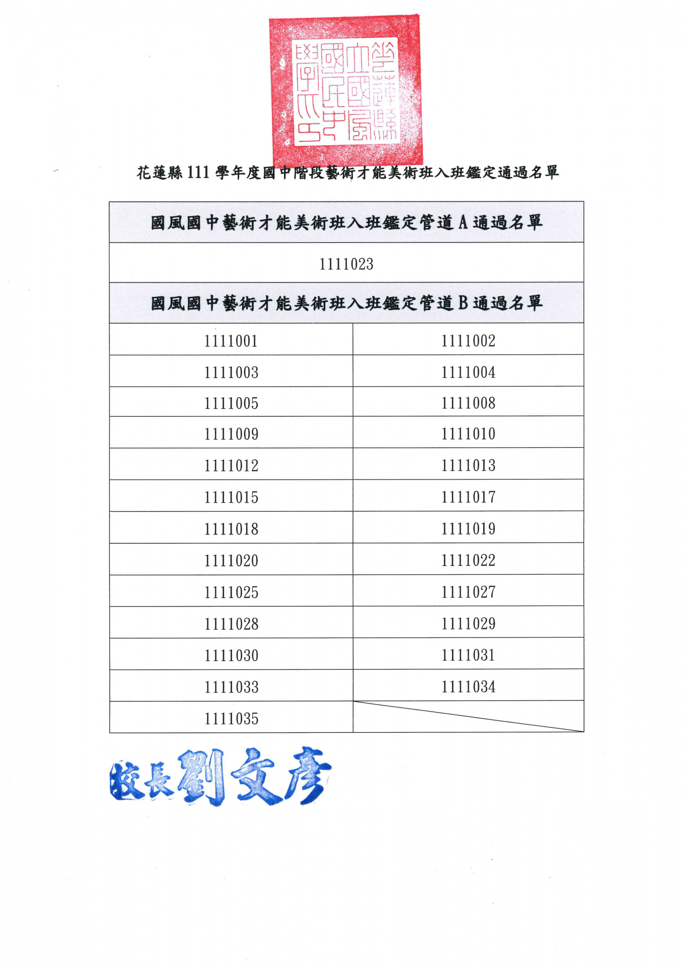 111學年國風國中藝術才能美術班入班鑑定通過名單