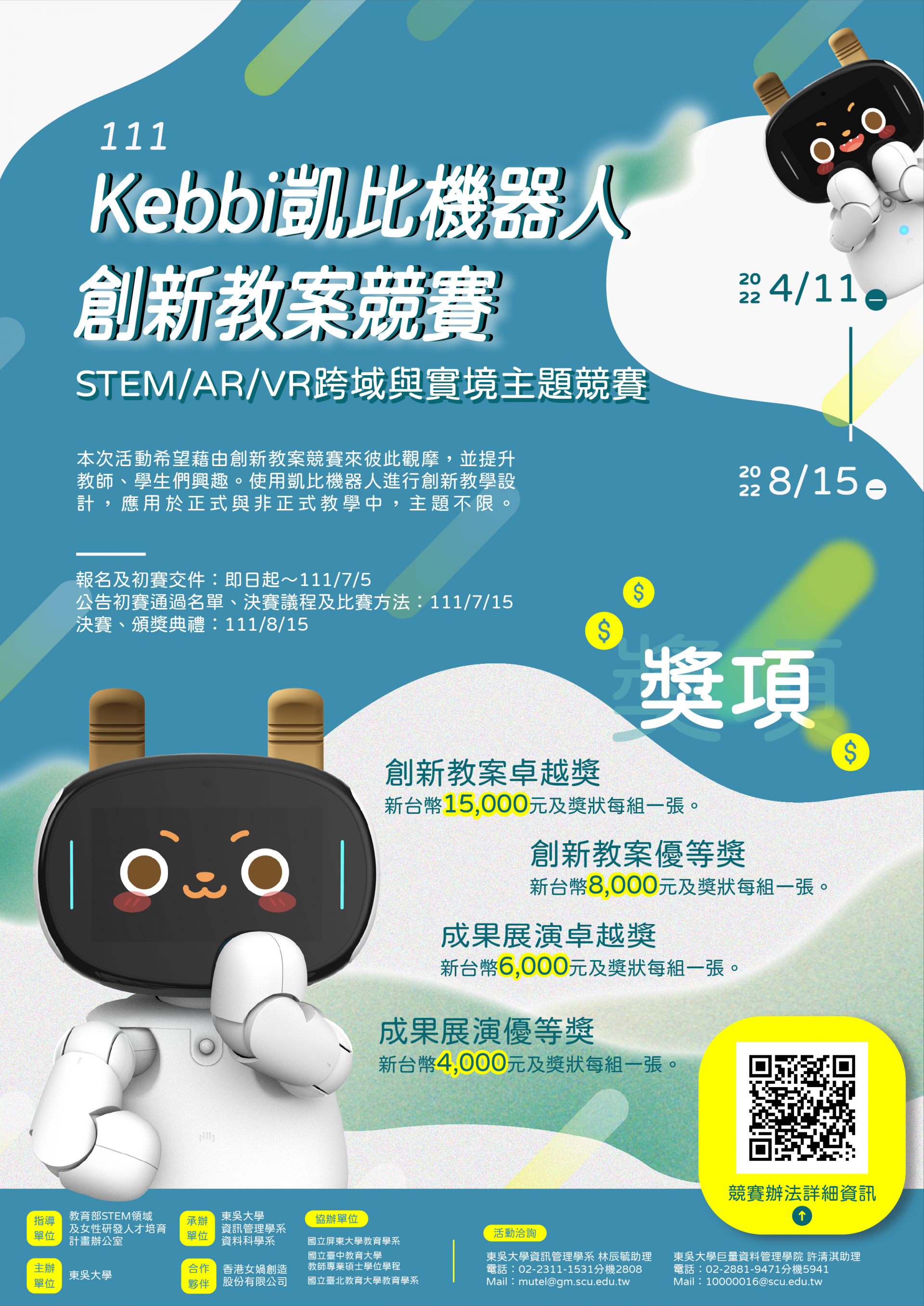 主旨: | 本校辦理「STEM/AR/VR 跨域與實境主題競賽 111 年 Kebbi 凱比機器人創新教案競賽」活動延長通知,敬請貴校協助公告,並鼓勵師生踴躍報名參加,請查照。 |
