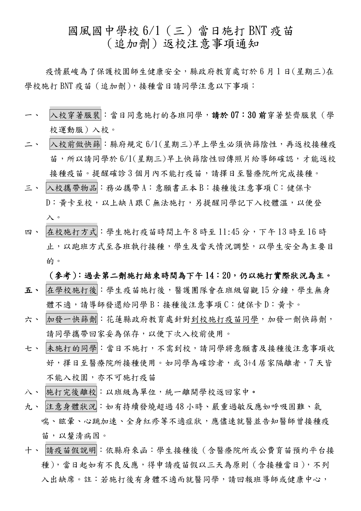 國風國中學校6/1(三)當日施打BNT疫苗 (追加劑)返校注意事項通知