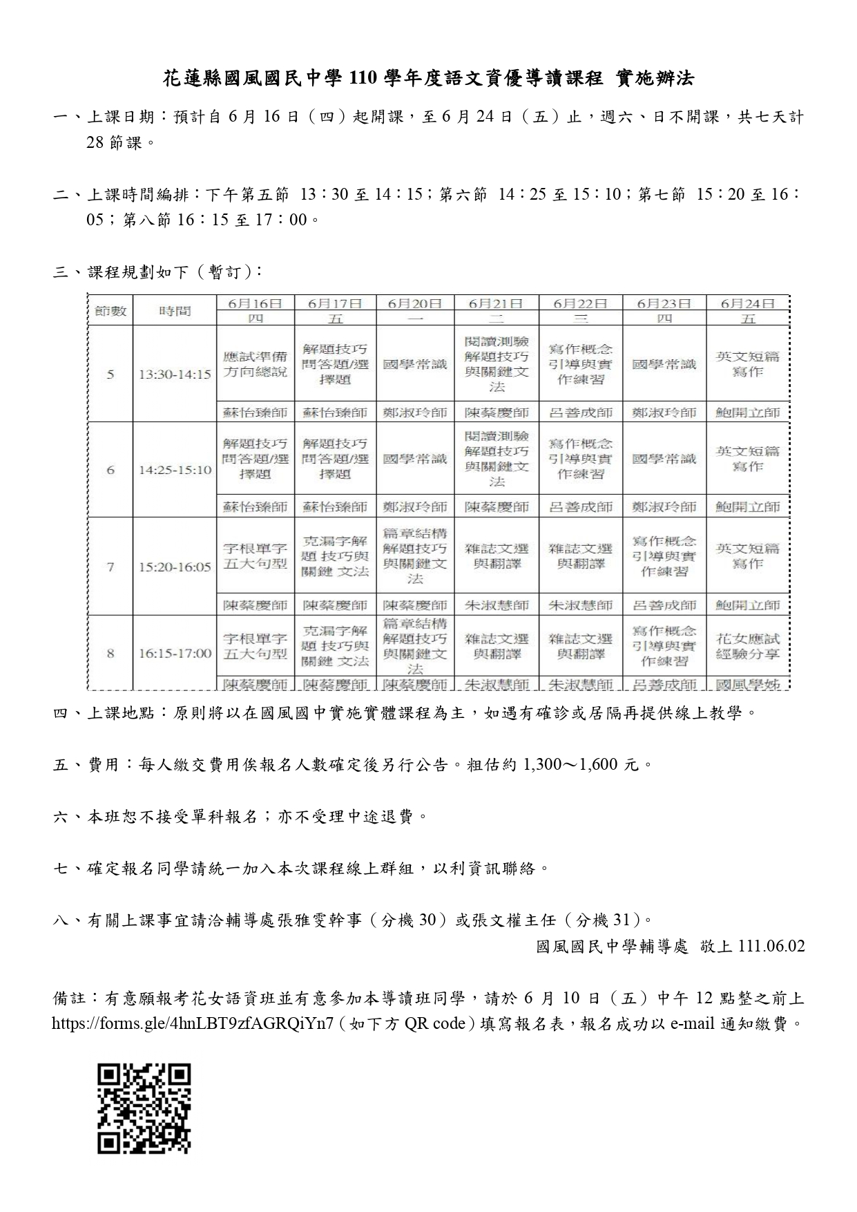 備註:有意願報考花女語資班並有意參加本導讀班同學,請於 6 月 10 日(五)中午 12 點整之前上 https://forms.gle/4hnLBT9zfAGRQiYn7 (如下方 QR code )填寫報名表,報名成功以 e-mail 通知繳費