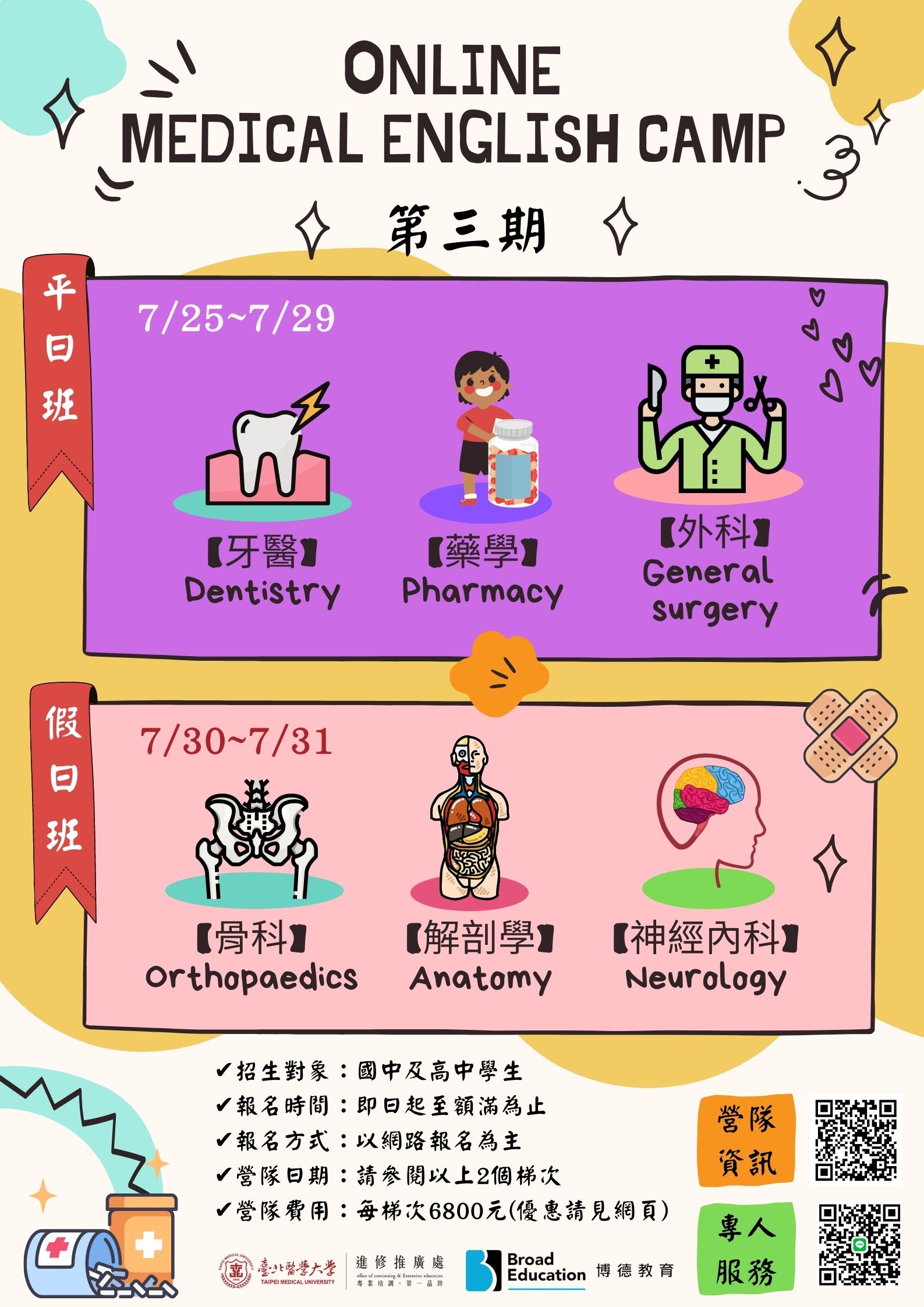 二、營隊將於 111 年 7 月 25 日至 111 年 7 月 31 日期間辦理「線上英文醫學營第 3 期」,總共預定辦理 2 個梯次的營隊,分別為第 1 梯平日班 7/25~7/29 、第 2 梯假日班 7/30~7/31 ,歡迎共襄盛舉。