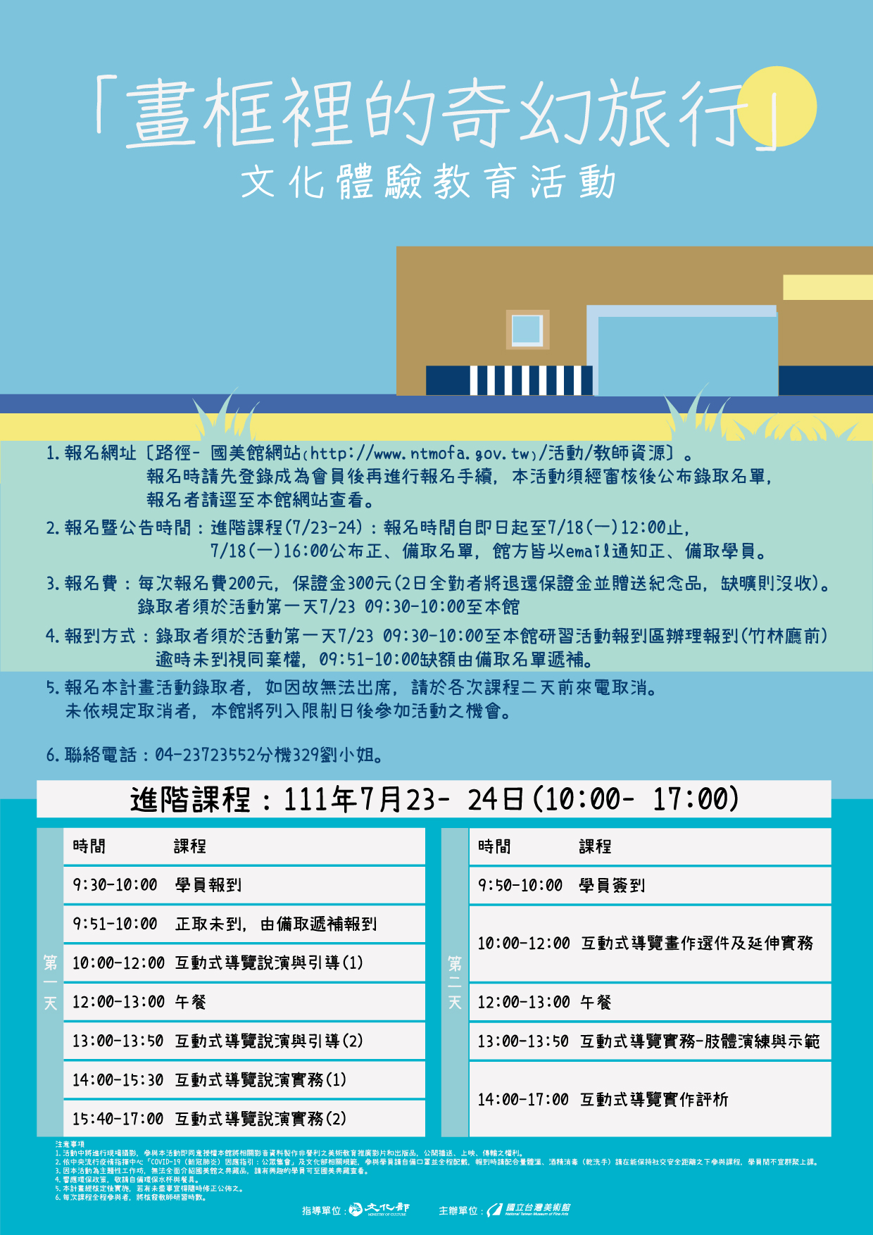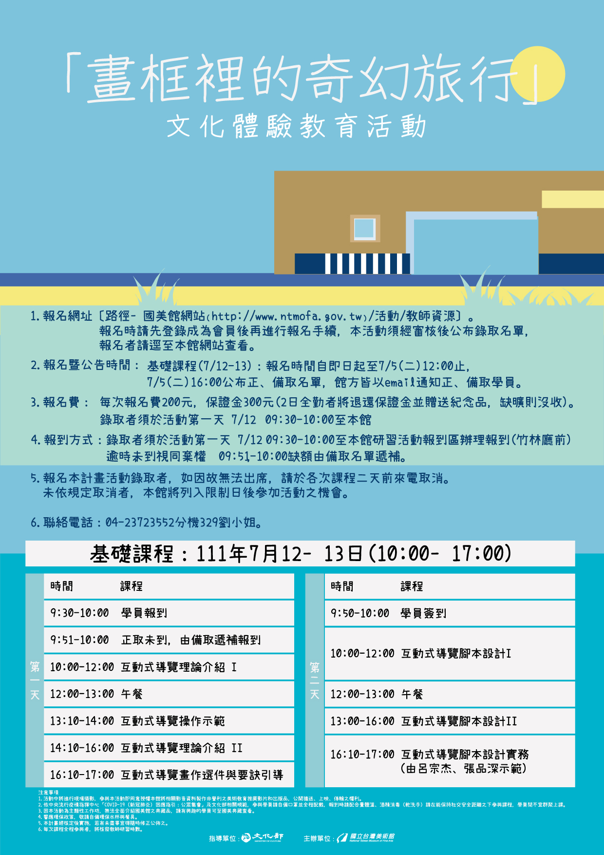 二、 | 旨揭活動分為兩梯次,分別訂於 111 年 7 月 12 日(二)-13 日(三)、 111 年 7 月 23 日(六)-24 日(日)於國立臺灣美術館 3 樓多元學藝廳辦理,有關活動內容及報名方式詳如簡章及活動網站。 |