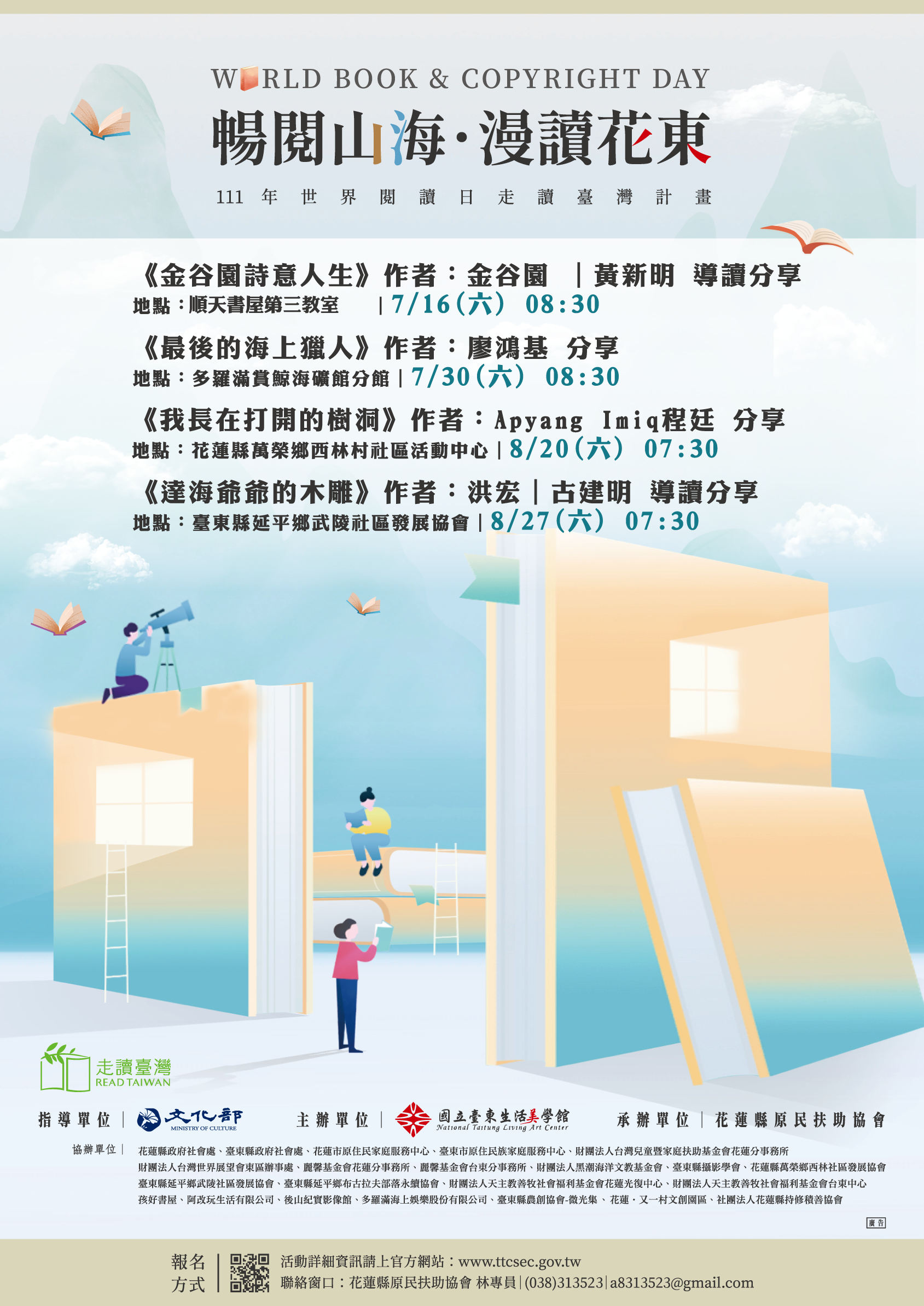 主旨: | 本會承辦國立臺東生活美學館辦理「111 年世界閱讀日走讀臺灣計畫-暢閱山海‧漫讀花東」活動,惠請貴單位踴躍報名及協助宣傳,詳如說明,請查照。 |