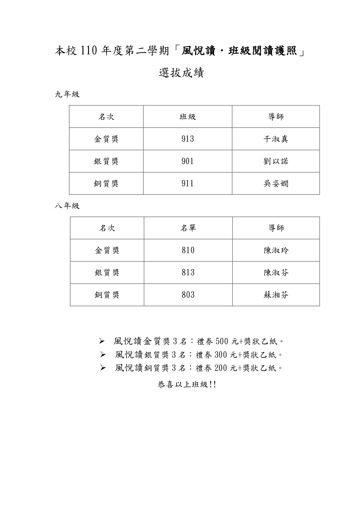 本校110年度第二學期「風悅讀.班級閱讀護照」 選拔成績