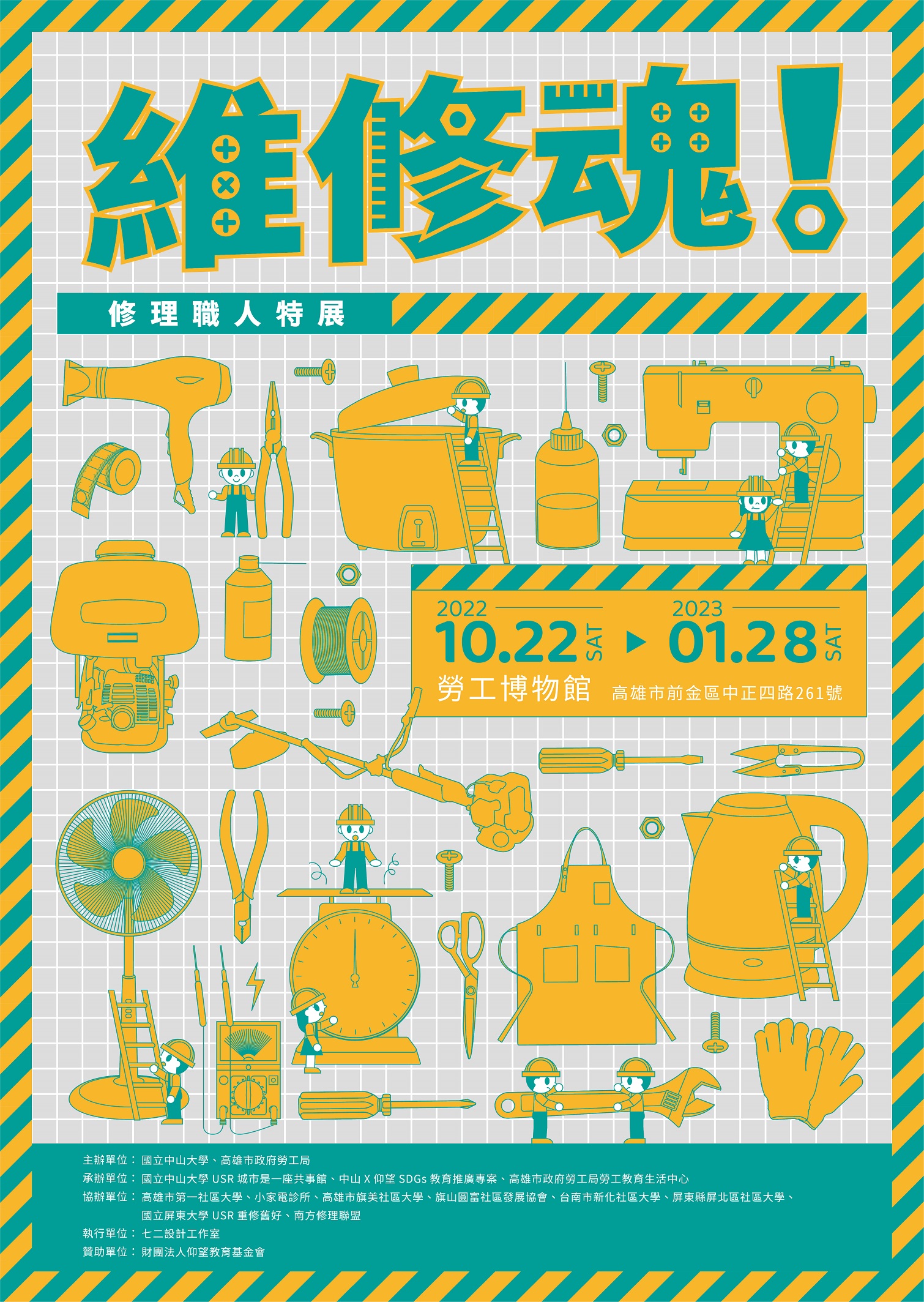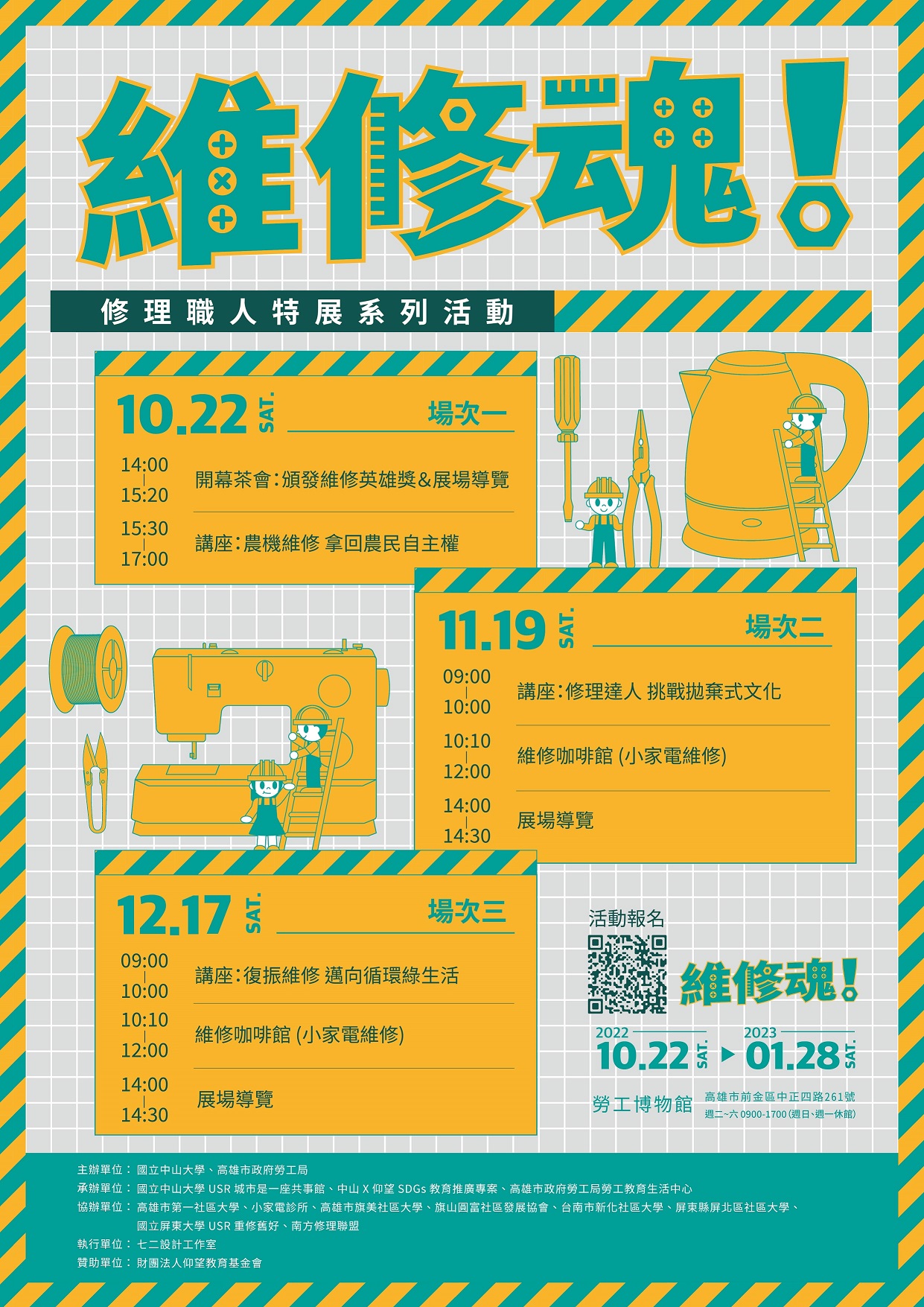 一、 | 展覽於民國 111 年 10 月 22 日至 112 年 1 月 28 日假高雄市勞工博物館(高雄市前金區中正四路 261 號)展出,以深入淺出的方式了解維修是循環經濟的一環,與其在當代環境、經濟、社會的多重價值。 |