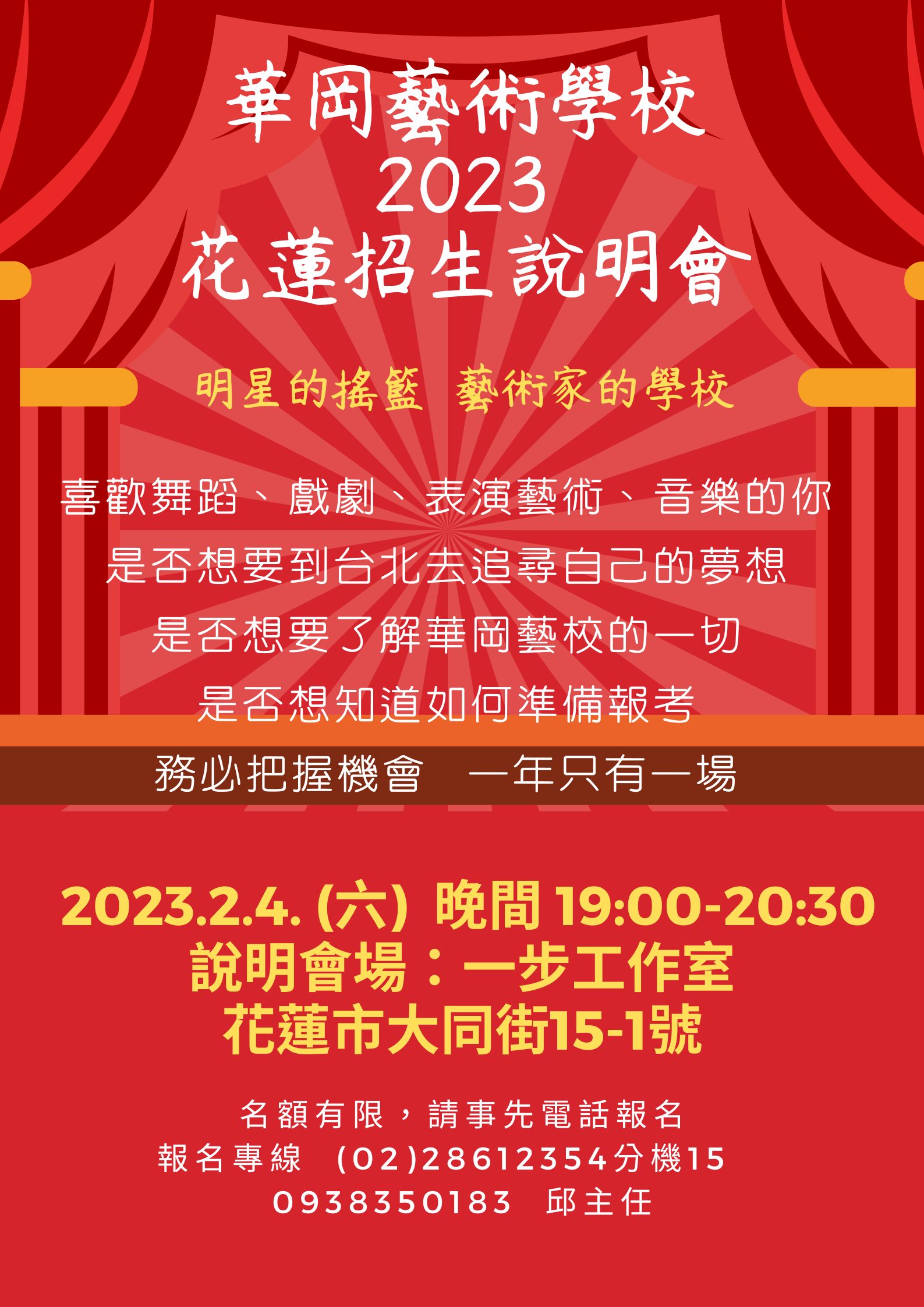 該校訂於 112 年 2 月 4 日(六)19:00-20:30 舉辦花蓮招生說明會,活動地點為一步工作室(花蓮市大同街 15-1 號)。